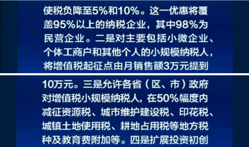 第一,提高增值稅小規模納稅人起征點,月銷售額3萬元調整到10萬元,即月銷售額10萬元以下的,不用再交納增值稅。