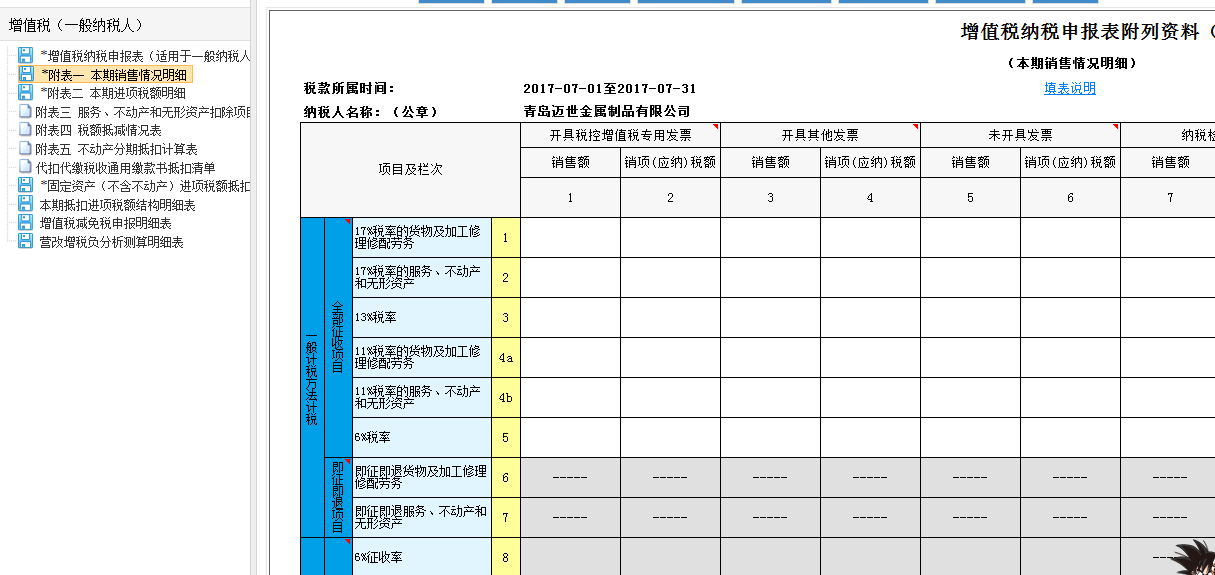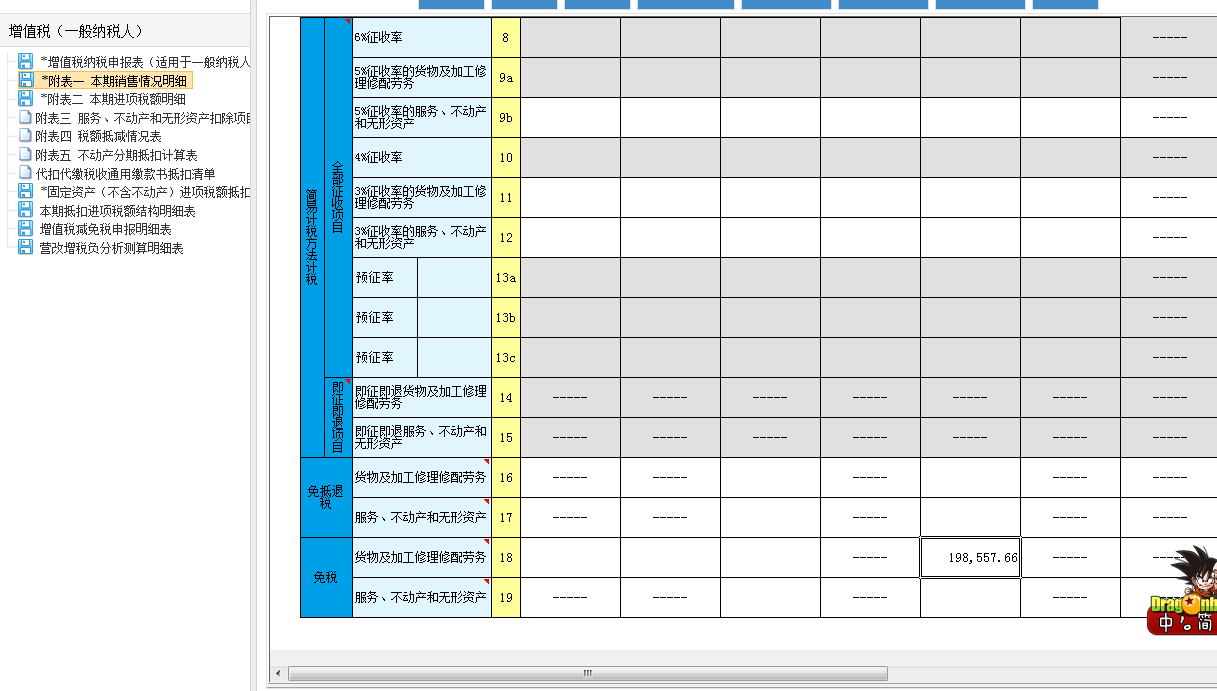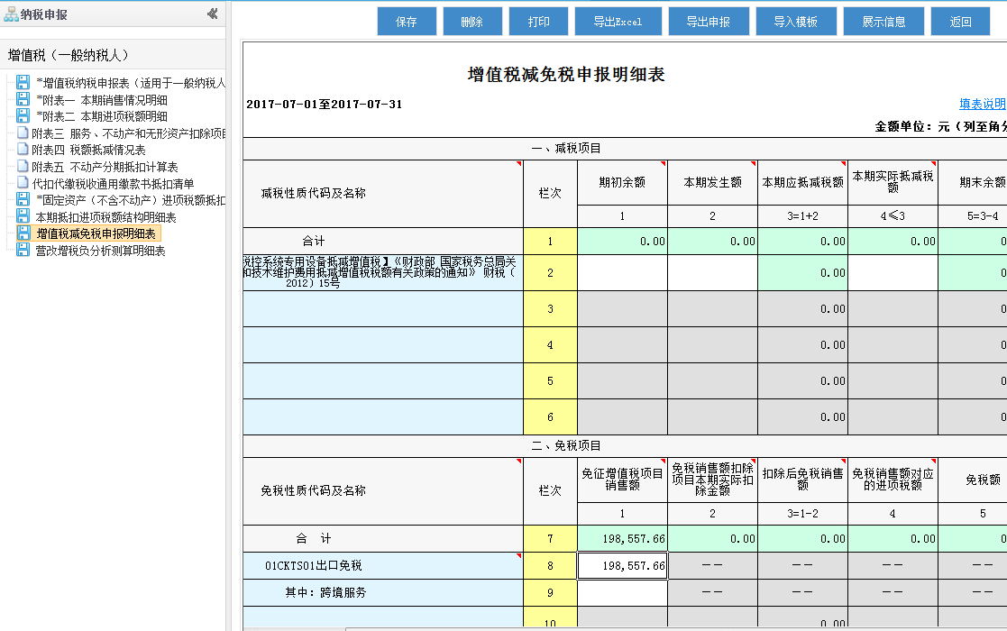 填寫后表格會檢測到免稅項目,自動啟用“增值稅減免稅申報明細表”,填入出口免稅欄內,實現申報免稅