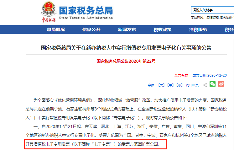 2020年12月20日,國家稅務總局宣布,增值稅專用發票電子化擴大到全國!(在全國新設立登記的納稅人)