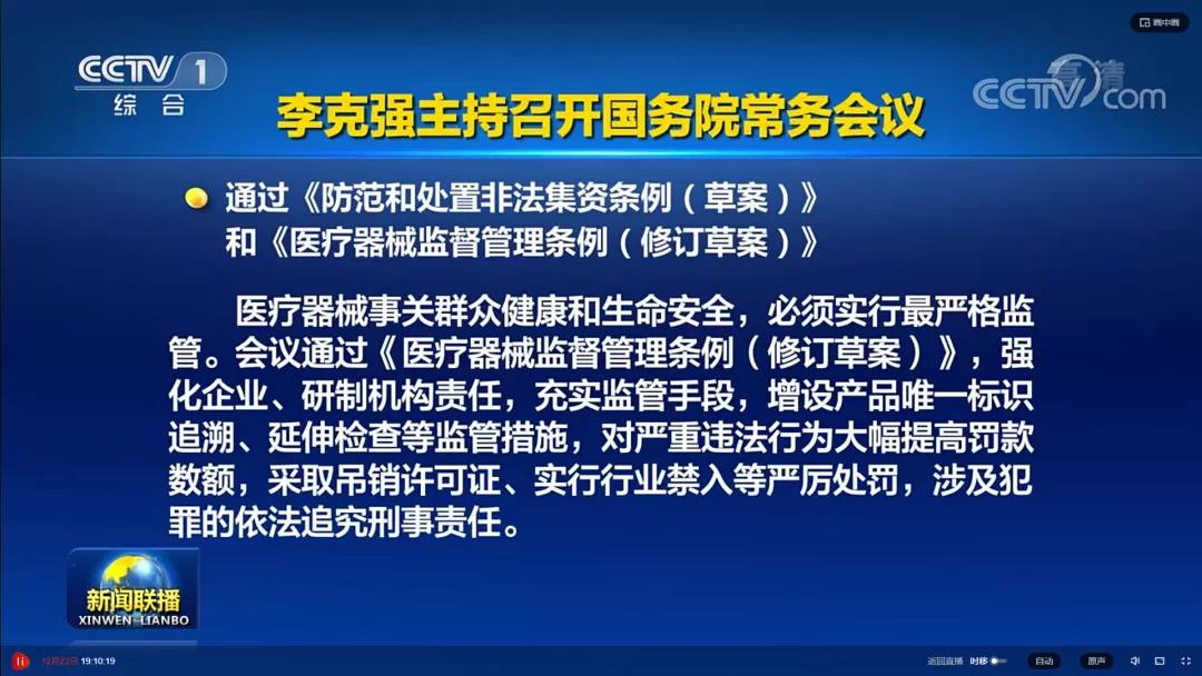 會議指出,醫療器械事關人民群眾身體健康和生命安全,必須實行最嚴格的監管。會議通過《醫療器械監督管理條例(修訂草案)》,強化企業、研制機構對醫療器械安全性有效性的責任,明確審批、備案程序,充實監管手段,增設產品唯一標識追溯、延伸檢查等監管措施,加大違法行為懲處力度,對涉及質量安全的嚴重違法行為大幅提高罰款數額,對嚴重違法單位及責任人采取吊銷許可證、實行行業和市場禁入等嚴厲處罰,涉及犯罪的依法追究刑事責任。