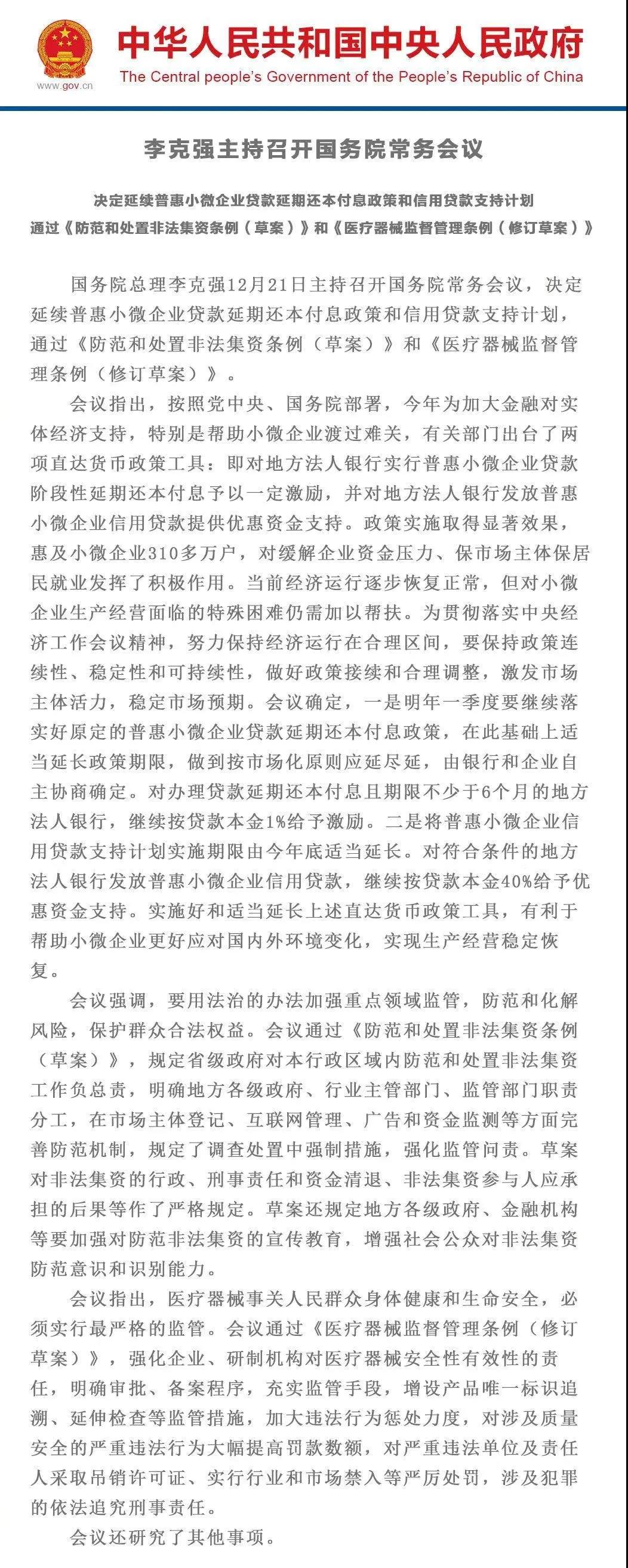國務院總理李克強12月21日主持召開國務院常務會議,決定延續普惠小微企業貸款延期還本付息政策和信用貸款支持計劃,通過《防范和處置非法集資條例(草案)》和《醫療器械監督管理條例(修訂草案)》。