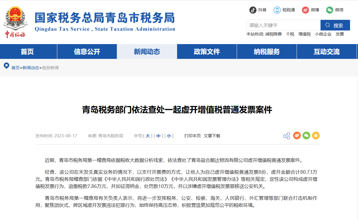 青島稅(shui)務部(bu)門依法查處一起虛(xu)開增值稅(shui)