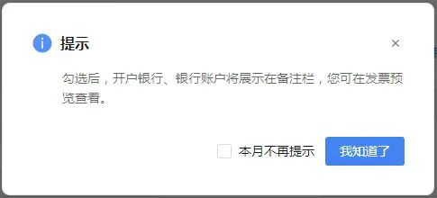 勾(gou)(gou)選(xuan)會(hui)提示:“勾(gou)(gou)選(xuan)后,開戶銀(yin)行(xing)、銀(yin)行(xing)賬戶將展示在備注(zhu)欄,您可在發票預覽查看。”點擊【我知道了】。