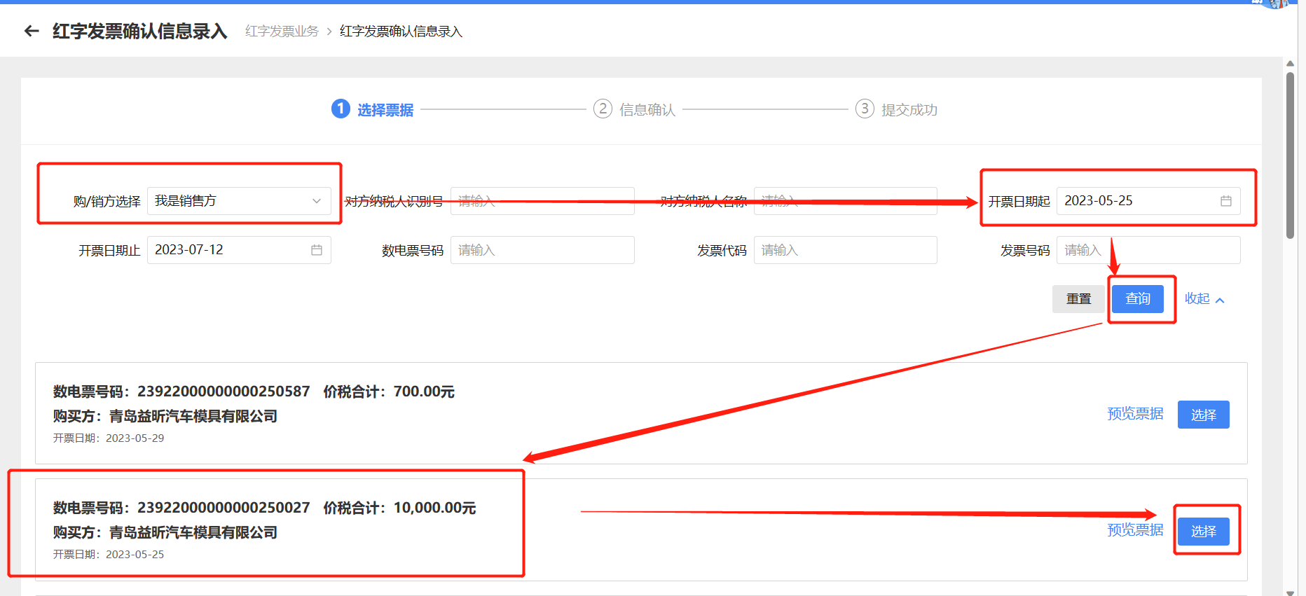 依次填入“購銷方選擇”、“開票日期”、“發票號碼”后點擊【選擇】。
