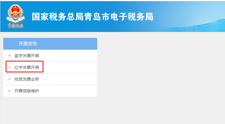 在國家稅務總局青島市電子稅務局首頁依次點擊【開票業務】-【紅字發票開具】。