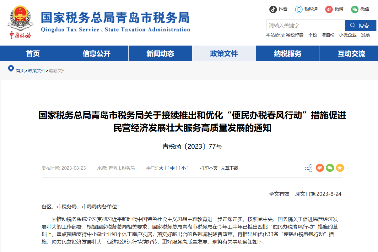 國家稅務總局青島市稅務局關于接續推出和優化“便民辦稅春風行動”措施促進民營經濟發展壯大服務高質量發展的通知