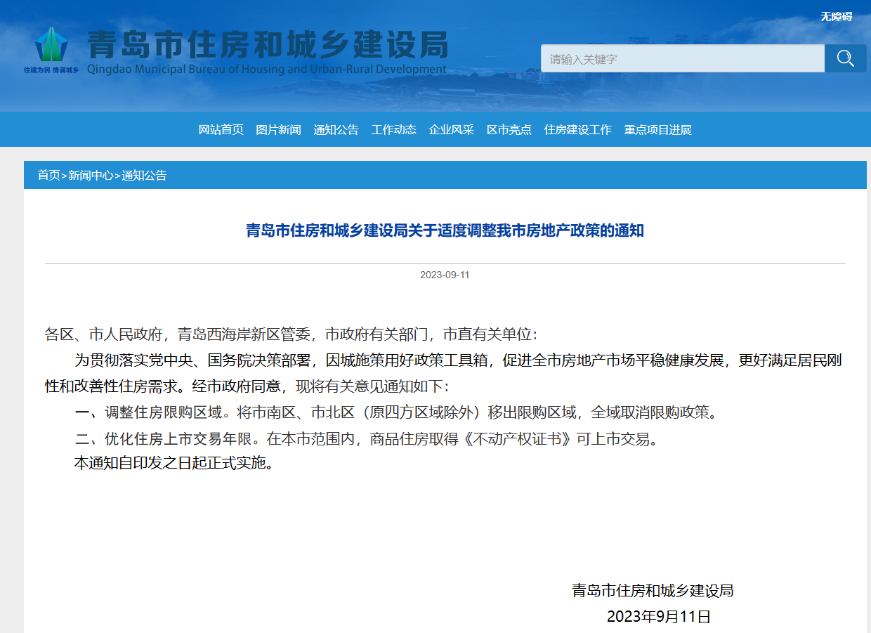 青島市住房和城鄉建設局關于適度調整我市房地產政策的通知