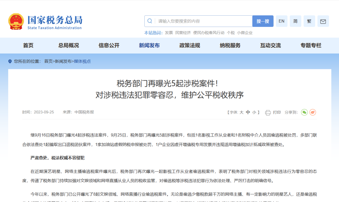繼9月16日稅(shui)務部(bu)門(men)曝光(guang)4起涉稅(shui)違法案件(jian),9月25日,稅(shui)務部(bu)門(men)再(zai)曝光(guang)5起涉稅(shui)案件(jian),包括(kuo)1名影視工作從業者(zhe)和1名財稅(shui)中介人(ren)員(yuan)因(yin)偷逃稅(shui)被處(chu)罰,多部(bu)門(men)聯(lian)合依法查處(chu)1起騙取(qu)出口退稅(shui)團(tuan)伙案件(jian),1家加(jia)油站虛假(jia)納稅(shui)申報(bao)被處(chu)罰,1戶(hu)企業因(yin)虛開增(zeng)值稅(shui)專用(yong)發票并(bing)違規適用(yong)增(zeng)值稅(shui)加(jia)計抵減政策被查處(chu)。