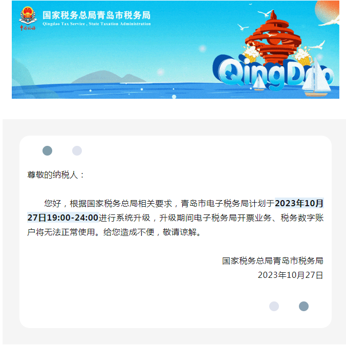 您好,根據國家稅務總局相關要求,青島市電子稅務局計劃于2023年10月27日19:00-24:00進行系統升級,升級期(qi)間電子稅務局開票業(ye)務、稅務數(shu)字賬戶將無法正常使用。給(gei)您造成(cheng)不便,敬請諒解。
