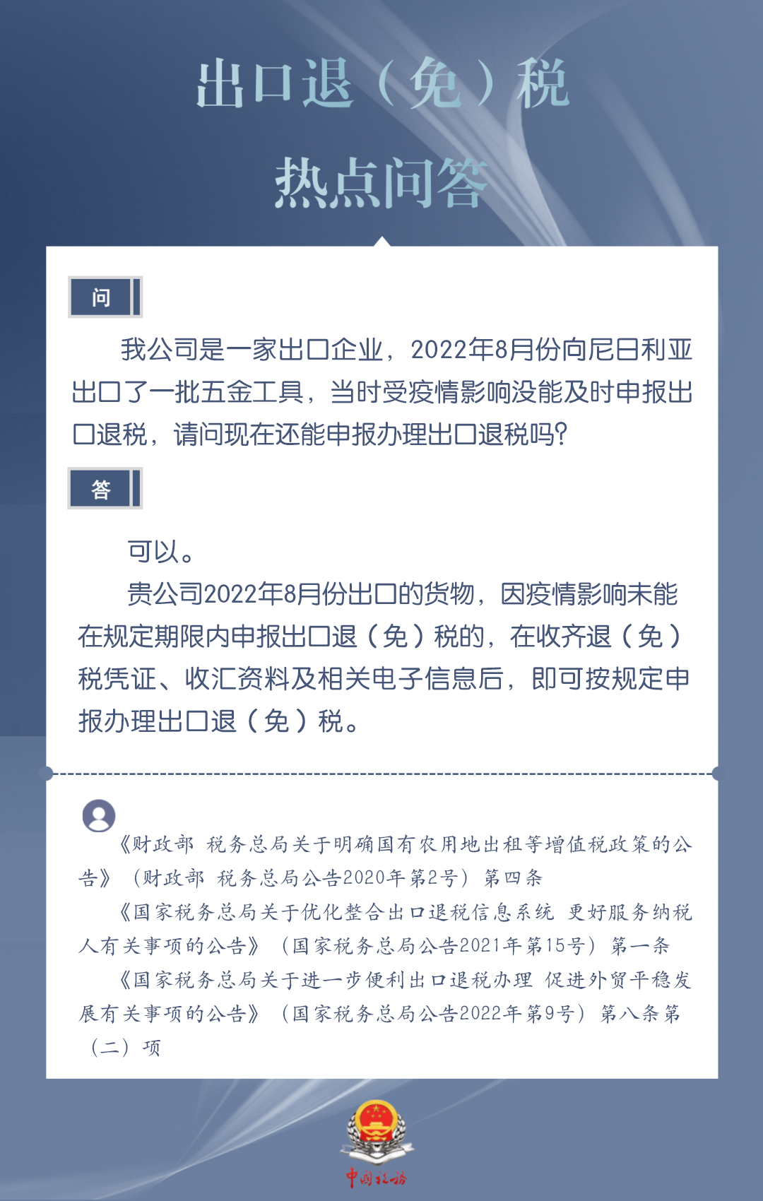 為進(jin)一步(bu)加力(li)支持包括中小(xiao)微(wei)企業(ye)在內的(de)廣大(da)經(jing)營主體開展外貿出口業(ye)務,便于企業(ye)掌(zhang)握出口退(tui)稅現行規(gui)定、及時了(le)解出口退(tui)稅便利化舉(ju)措,商務部、國家(jia)稅務總局針對(dui)企業(ye)普遍關心的(de)出口退(tui)稅熱點(dian)(dian)問(wen)題,整理了(le)問(wen)答集錦(jin)。我們將陸續發布熱點(dian)(dian)問(wen)答相關內容,今天發布:出口企業受疫情影響沒能及時申報的出口退稅現在還能申報辦理嗎?