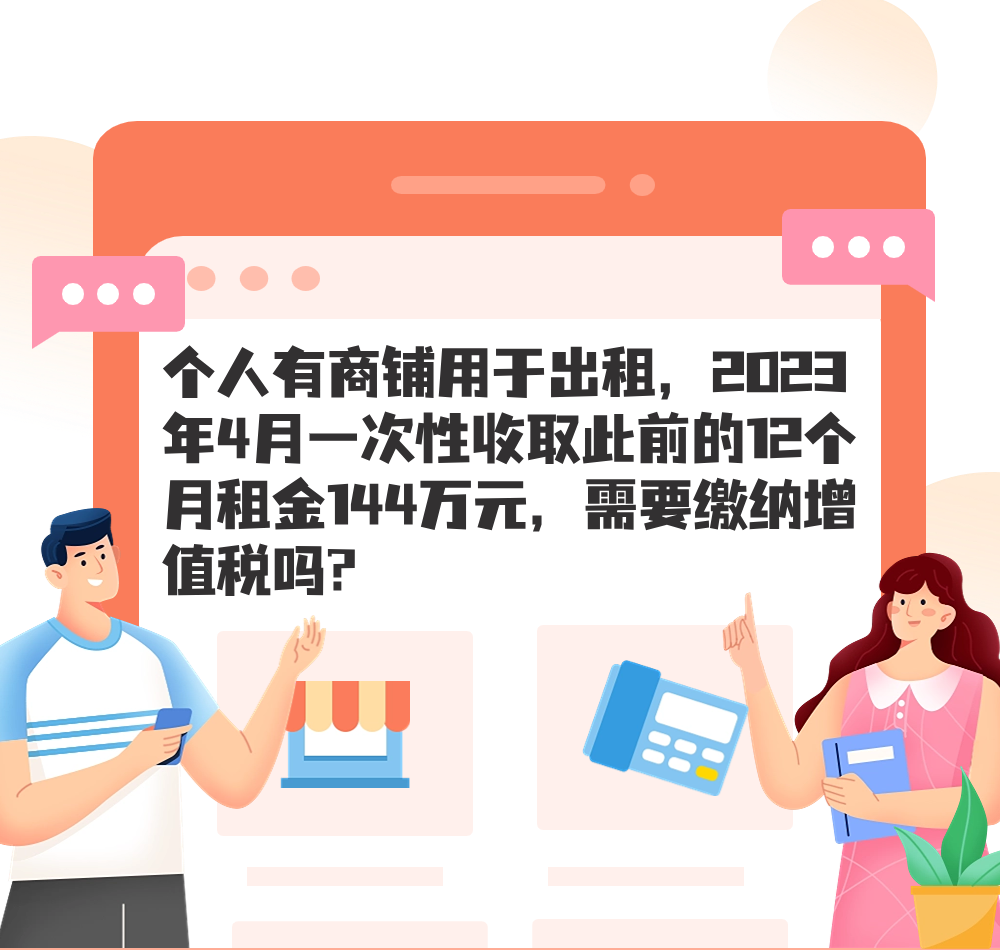 個人有商鋪用于出租,2023年4月一次性收取此前的12個月租金144萬元,需要繳納增值稅嗎?
