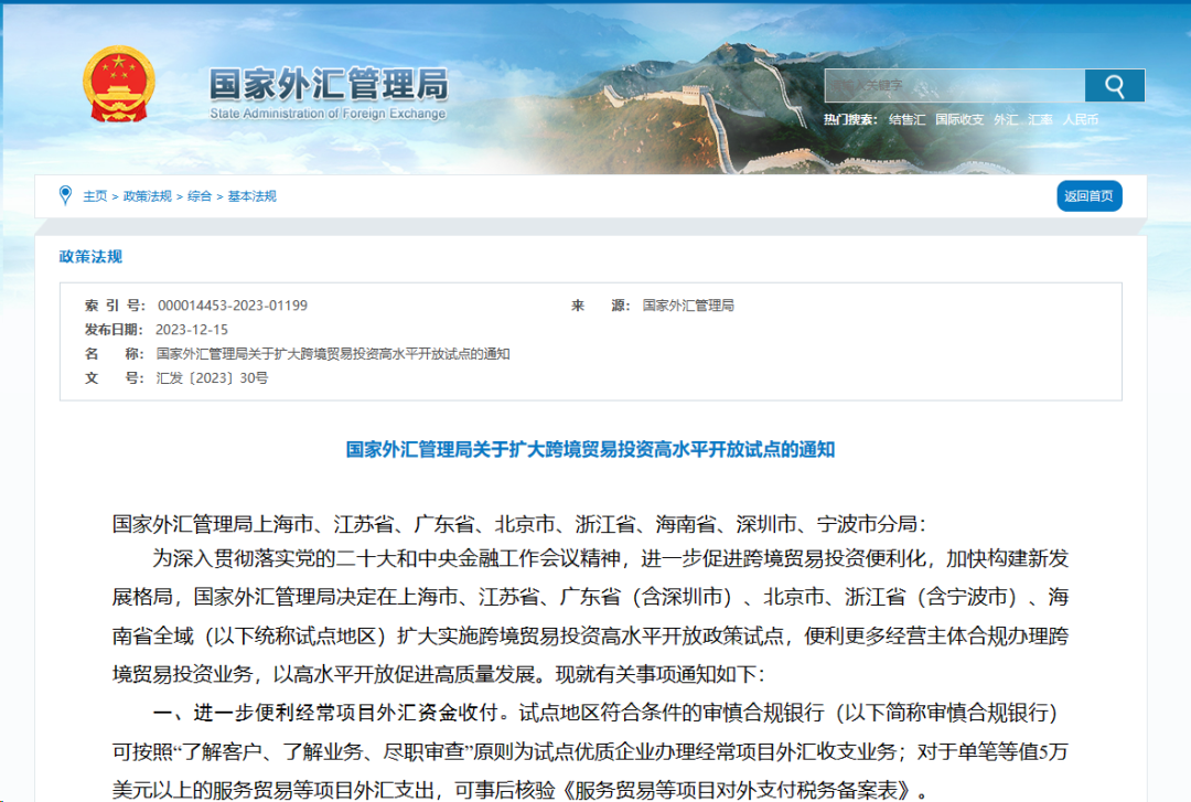 為深入(ru)貫徹落實(shi)黨的(de)二十大和(he)中(zhong)央金融工(gong)作會議精(jing)神,進一(yi)步促進跨境貿(mao)易投(tou)資便利(li)化,加快(kuai)構建新(xin)發展格局(ju),國(guo)家外匯(hui)管理局(ju)決(jue)定在上海(hai)市(shi)、江蘇省、廣東省(含深圳市(shi))、北京市(shi)、浙(zhe)江省(含寧波(bo)市(shi))、海(hai)南省全域(以下統(tong)稱試點地區(qu))擴大實施跨境貿(mao)易投資高水(shui)平(ping)開(kai)放政策試點,便利(li)更(geng)多經營主體合規(gui)辦理(li)跨境貿(mao)易投資業務(wu),以(yi)高水(shui)平(ping)開(kai)放促進高質量發(fa)展(zhan)。現就有關事項(xiang)通知如下: