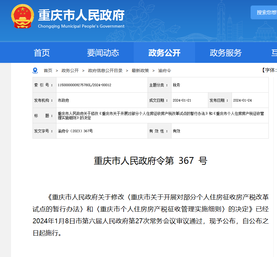 2024年(nian)1月21日,重(zhong)慶市(shi)政(zheng)府出臺《重(zhong)慶市(shi)人(ren)民(min)政(zheng)府關(guan)于修改〈重(zhong)慶市(shi)關(guan)于開展對部分個(ge)人(ren)住房(fang)征(zheng)(zheng)收(shou)房(fang)產稅改革(ge)試(shi)點的暫行辦法〉和〈重(zhong)慶市(shi)個(ge)人(ren)住房(fang)房(fang)產稅征(zheng)(zheng)收(shou)管(guan)理實施細則〉的決定》(重(zhong)慶市(shi)人(ren)民(min)政(zheng)府令第367號,以下簡稱《決定》)。為(wei)便(bian)于社會(hui)公眾廣泛知曉《決定》內容,現對相關(guan)政(zheng)策作如下解讀。