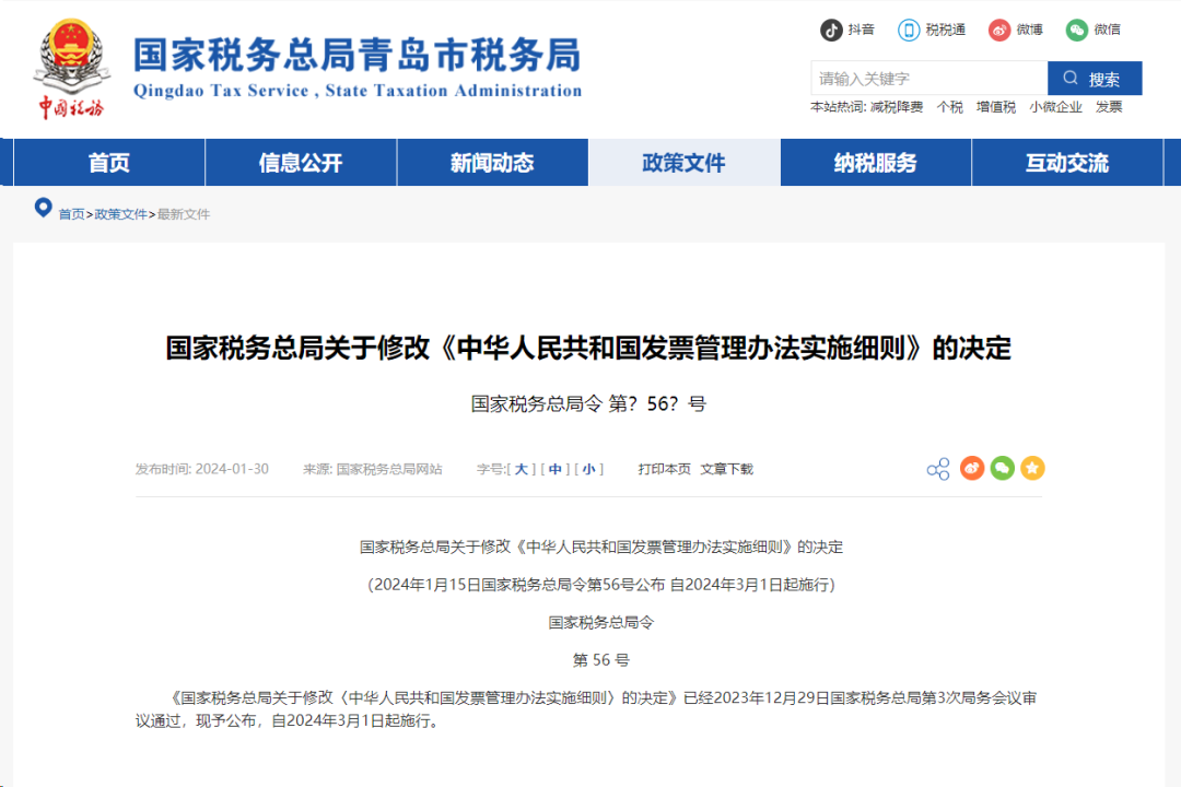 《國(guo)家稅務(wu)總局(ju)關(guan)于修改〈中華人民共和國(guo)發票(piao)管理辦法實施(shi)(shi)細則〉的決定》已經2023年12月29日國(guo)家稅務(wu)總局(ju)第3次局(ju)務(wu)會議審(shen)議通(tong)過,現予公布,自2024年3月1日起施(shi)(shi)行。