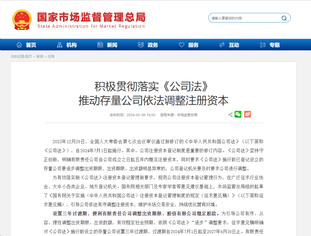 2023年(nian)(nian)(nian)12月(yue)29日(ri),全(quan)國人大常委會第七(qi)次會議審(shen)議通(tong)過新(xin)修訂(ding)的(de)《中(zhong)華人民共和(he)國公(gong)司(si)法(fa)》(以下簡稱《公(gong)司(si)法(fa)》),自2024年(nian)(nian)(nian)7月(yue)1日(ri)起(qi)施行。其中(zhong),公(gong)司(si)注(zhu)冊(ce)資(zi)本登(deng)記制度是重要(yao)(yao)的(de)修訂(ding)內容(rong)。《公(gong)司(si)法(fa)》堅(jian)持守正創新(xin),明(ming)確有限責(ze)任公(gong)司(si)自公(gong)司(si)成立(li)之日(ri)起(qi)五(wu)年(nian)(nian)(nian)內繳(jiao)足(zu)注(zhu)冊(ce)資(zi)本,同(tong)時(shi)要(yao)(yao)求《公(gong)司(si)法(fa)》施行前已登(deng)記設(she)立(li)的(de)存(cun)量公(gong)司(si)要(yao)(yao)逐步(bu)調整出(chu)資(zi)期限,出(chu)資(zi)期限、出(chu)資(zi)額明(ming)顯異常的(de),公(gong)司(si)登(deng)記機關要(yao)(yao)及時(shi)要(yao)(yao)求公(gong)司(si)進行調整。