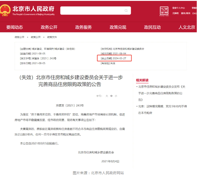 3月27日,據北(bei)京市人(ren)民政(zheng)府網站顯示,《北(bei)京市住(zhu)房和城鄉建設委員會關于(yu)進(jin)一步(bu)完善商品住(zhu)房限購(gou)政(zheng)策的公告》已(yi)經正式廢止。