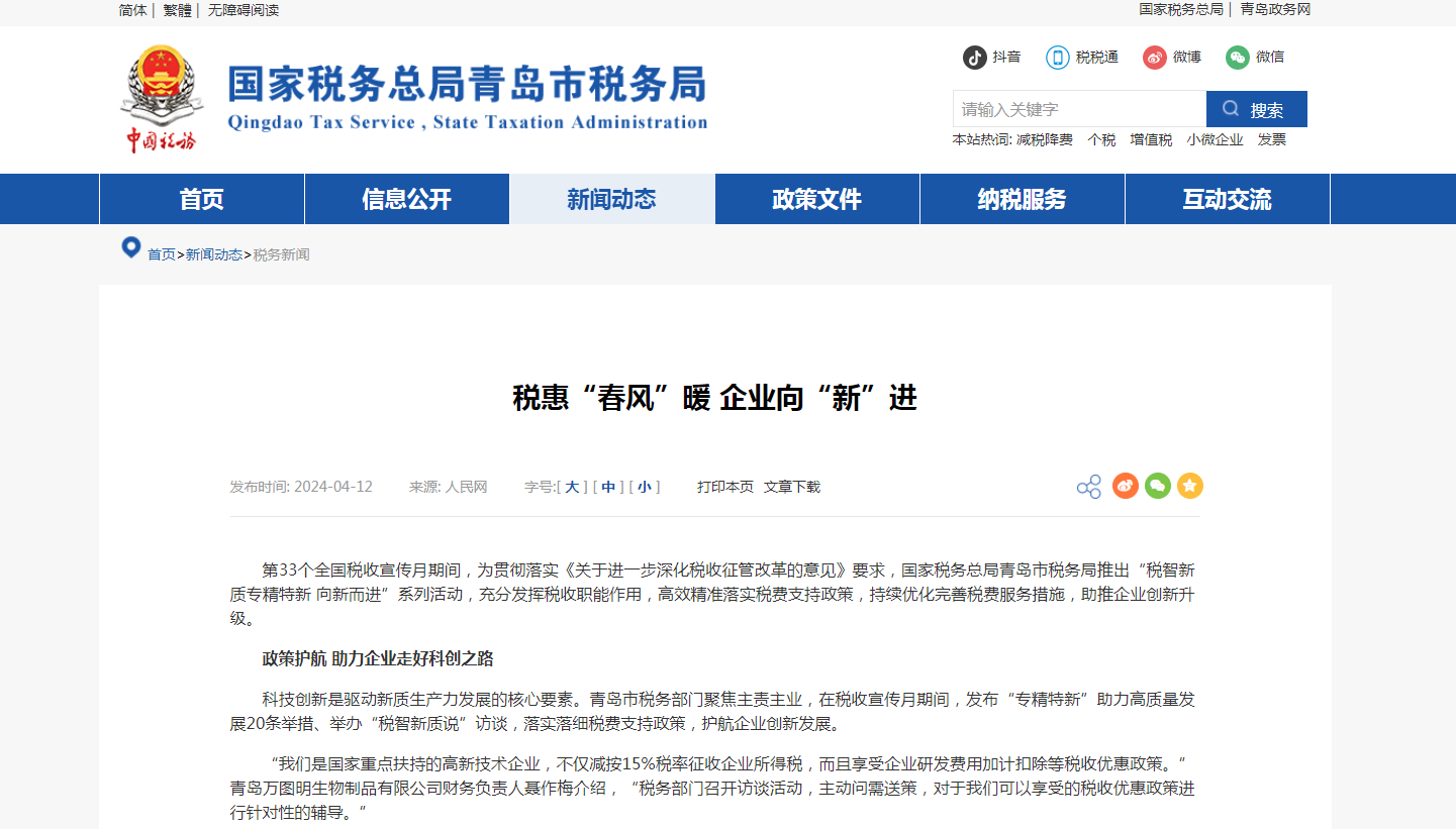 “我們是國家重點扶(fu)持的高新技(ji)術企(qi)(qi)業(ye)(ye),不(bu)僅減按15%稅(shui)率征收企(qi)(qi)業(ye)(ye)所得稅(shui),而且享受企(qi)(qi)業(ye)(ye)研(yan)發費用加計扣除(chu)等(deng)稅(shui)收優惠(hui)政策。”青(qing)島萬圖明生物制品有限公(gong)司財務負責(ze)人聶(nie)作梅(mei)介紹,“稅(shui)務部門召(zhao)開訪談活動,主動問需送策,對(dui)于我們可以(yi)享受的稅(shui)收優惠(hui)政策進行針(zhen)對(dui)性(xing)的輔導。”