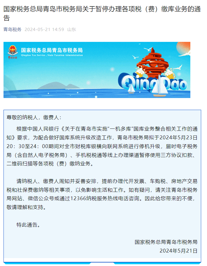 根據中國人民銀行《關于在青島市實施“一機多庫”國庫業務整合相關工作的通知》要求,為配合做好國庫系統升級改造工作,青島市稅務局擬于2024年5月23日20:30至24:00期間對全市財稅庫銀橫向聯網系統進行停機升級,屆時電子稅務局(含自然人電子稅務局)、手機稅稅通等線上辦理渠道暫停使用三方協議扣款、二維碼掃描等各項稅(費)繳納業務。