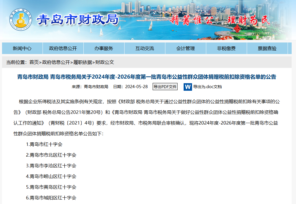 青島市財政局 青島市稅務局關于2024年度-2026年度第一批青島市公益性群眾團體捐贈稅前扣除資格名單的公告
