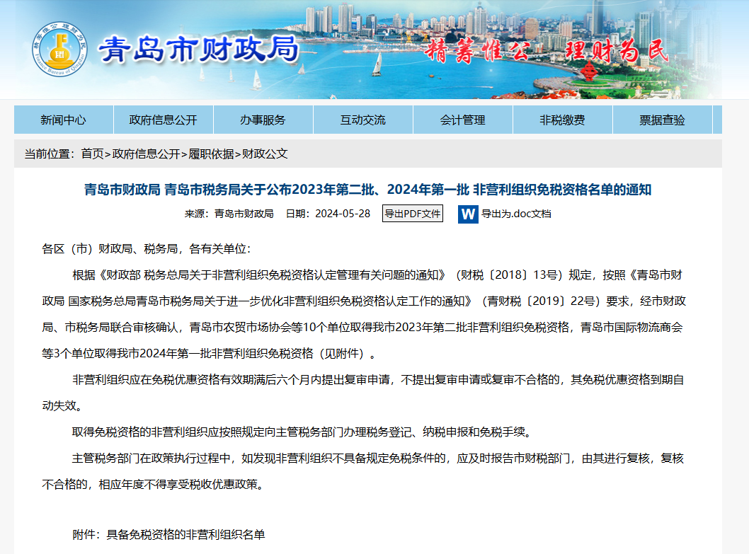 青島市財政局 青島市稅務局關于公布2023年第(di)二(er)批、2024年第(di)一批 非營(ying)利組織免(mian)稅資格名單的(de)通知