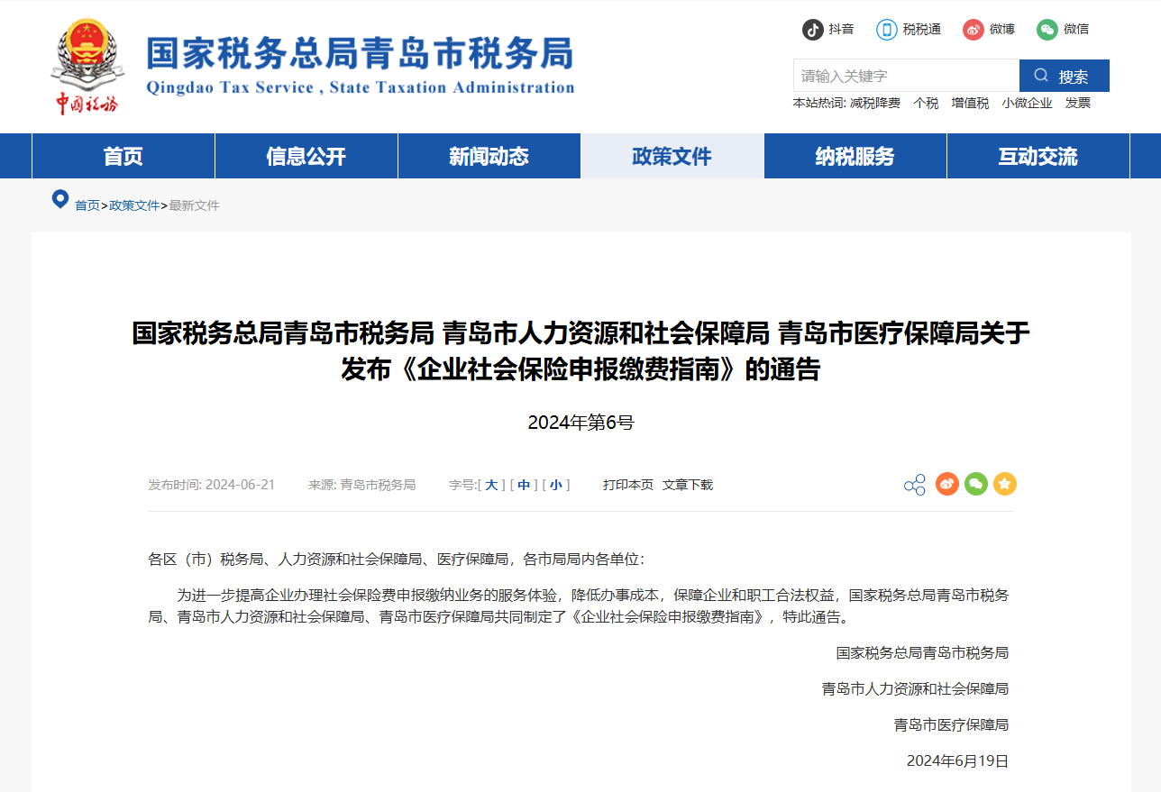 國家稅(shui)(shui)務總局(ju)(ju)青島市(shi)稅(shui)(shui)務局(ju)(ju) 青島市(shi)人力資源(yuan)和社會保(bao)(bao)障局(ju)(ju) 青島市(shi)醫療保(bao)(bao)障局(ju)(ju)關于發(fa)布《企業社會保(bao)(bao)險申報繳費指南》的通(tong)告