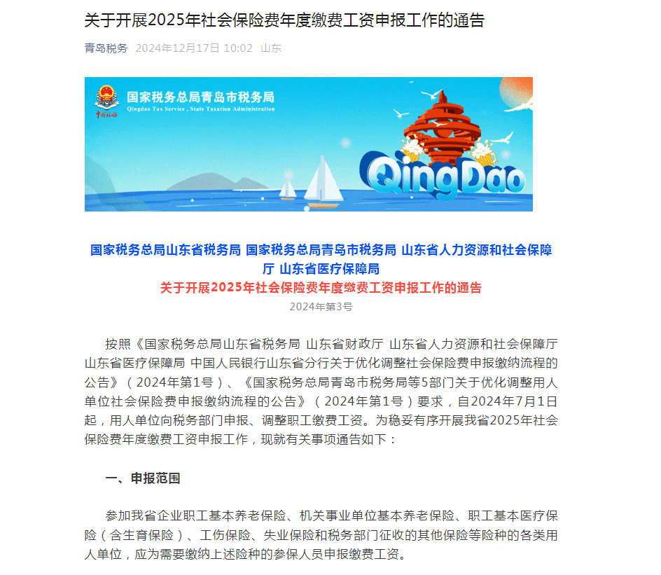 按照(zhao)《國(guo)家(jia)稅(shui)(shui)務總(zong)局(ju)(ju)(ju)山(shan)(shan)東(dong)省(sheng)稅(shui)(shui)務局(ju)(ju)(ju) 山(shan)(shan)東(dong)省(sheng)財政(zheng)廳(ting) 山(shan)(shan)東(dong)省(sheng)人(ren)(ren)力資(zi)源和社(she)會(hui)(hui)(hui)保障(zhang)(zhang)廳(ting) 山(shan)(shan)東(dong)省(sheng)醫療保障(zhang)(zhang)局(ju)(ju)(ju) 中(zhong)國(guo)人(ren)(ren)民銀行山(shan)(shan)東(dong)省(sheng)分行關(guan)于優化調(diao)整(zheng)社(she)會(hui)(hui)(hui)保險費(fei)申報(bao)(bao)繳(jiao)納流程的公告(gao)》(2024年第1號)、《國(guo)家(jia)稅(shui)(shui)務總(zong)局(ju)(ju)(ju)青島市稅(shui)(shui)務局(ju)(ju)(ju)等5部(bu)門關(guan)于優化調(diao)整(zheng)用(yong)(yong)人(ren)(ren)單(dan)位社(she)會(hui)(hui)(hui)保險費(fei)申報(bao)(bao)繳(jiao)納流程的公告(gao)》(2024年第1號)要求,自2024年7月1日起,用(yong)(yong)人(ren)(ren)單(dan)位向稅(shui)(shui)務部(bu)門申報(bao)(bao)、調(diao)整(zheng)職(zhi)工繳(jiao)費(fei)工資(zi)。為穩妥有序開展我省(sheng)2025年社(she)會(hui)(hui)(hui)保險費(fei)年度繳(jiao)費(fei)工資(zi)申報(bao)(bao)工作,現就有關(guan)事(shi)項通告(gao)如下: