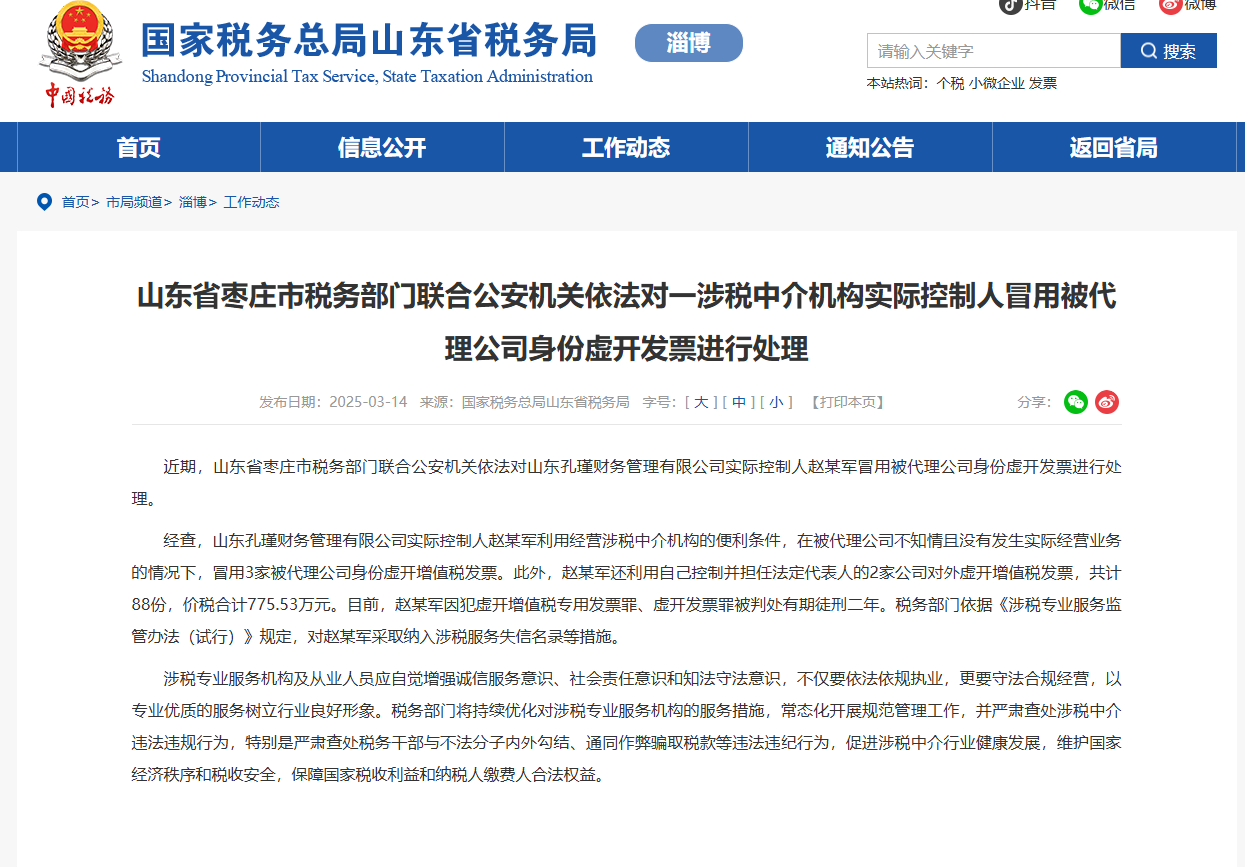 山東省棗莊市稅務部門聯合公安機關依法對一涉稅中介機構實際控制人冒用被代理公司身份虛開發票進行處理
