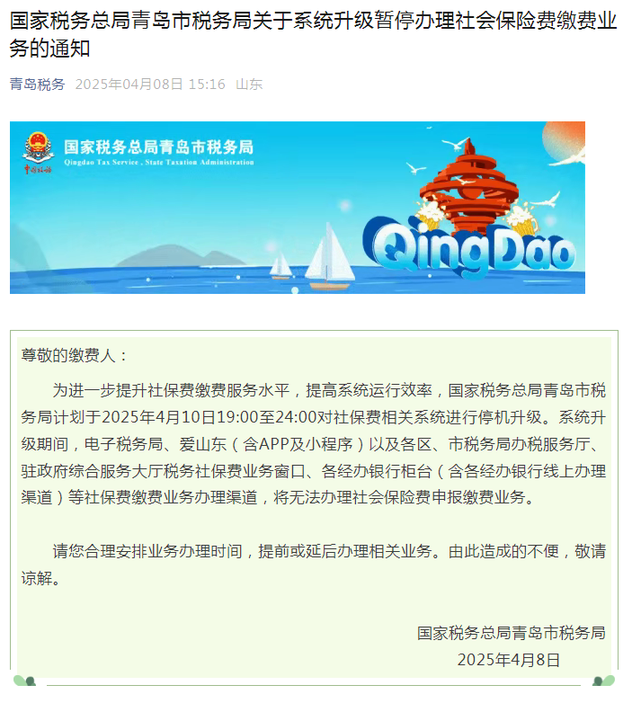 為(wei)進一步提(ti)升社(she)(she)保費(fei)(fei)(fei)繳(jiao)費(fei)(fei)(fei)服(fu)(fu)務(wu)(wu)(wu)(wu)(wu)水平,提(ti)高(gao)系(xi)統(tong)運行效率,國(guo)家(jia)稅(shui)務(wu)(wu)(wu)(wu)(wu)總局(ju)青島市稅(shui)務(wu)(wu)(wu)(wu)(wu)局(ju)計(ji)劃于2025年4月10日19:00至24:00對(dui)社(she)(she)保費(fei)(fei)(fei)相關系(xi)統(tong)進行停(ting)機升級。系(xi)統(tong)升級期間(jian),電子稅(shui)務(wu)(wu)(wu)(wu)(wu)局(ju)、愛山(shan)東(含APP及小程序)以及各(ge)區、市稅(shui)務(wu)(wu)(wu)(wu)(wu)局(ju)辦稅(shui)服(fu)(fu)務(wu)(wu)(wu)(wu)(wu)廳、駐(zhu)政府綜合服(fu)(fu)務(wu)(wu)(wu)(wu)(wu)大廳稅(shui)務(wu)(wu)(wu)(wu)(wu)社(she)(she)保費(fei)(fei)(fei)業(ye)務(wu)(wu)(wu)(wu)(wu)窗口、各(ge)經(jing)辦銀行柜臺(含各(ge)經(jing)辦銀行線上辦理渠(qu)道)等社(she)(she)保費(fei)(fei)(fei)繳(jiao)費(fei)(fei)(fei)業(ye)務(wu)(wu)(wu)(wu)(wu)辦理渠(qu)道,將無法辦理社(she)(she)會保險費(fei)(fei)(fei)申報繳(jiao)費(fei)(fei)(fei)業(ye)務(wu)(wu)(wu)(wu)(wu)。