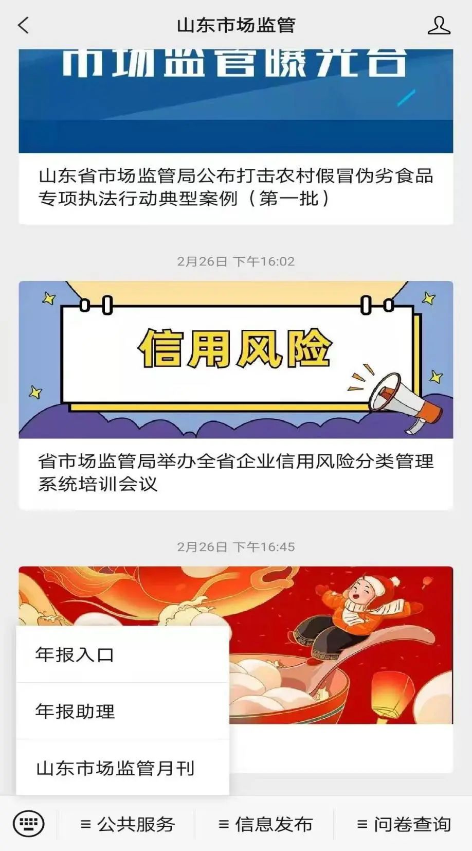 1、關注“山東市場監管”微信公眾號,點擊菜單欄“公共服務—年報入口”。